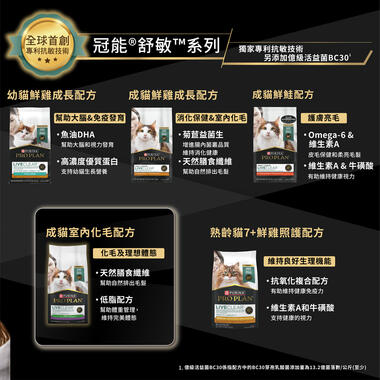 冠能舒敏成貓室內化毛配方使用火雞肉為第一主成分。添加天然膳食纖維,幫助自然排出毛髮。亦添加億級活益菌BC30幫助消化機能和維持免疫健康。