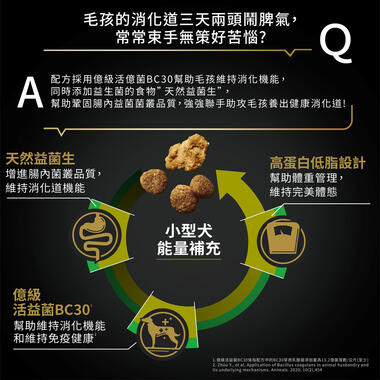 - 支持小型成犬消化保健及維持理想體態