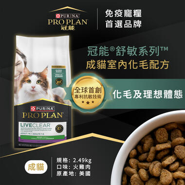 冠能舒敏成貓室內化毛配方使用火雞肉為第一主成分。添加天然膳食纖維,幫助自然排出毛髮。亦添加億級活益菌BC30幫助消化機能和維持免疫健康。