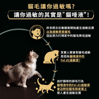 - 美國獨家專利抗敏技術,科學實證降低貓唾液中的Fel d1過敏原