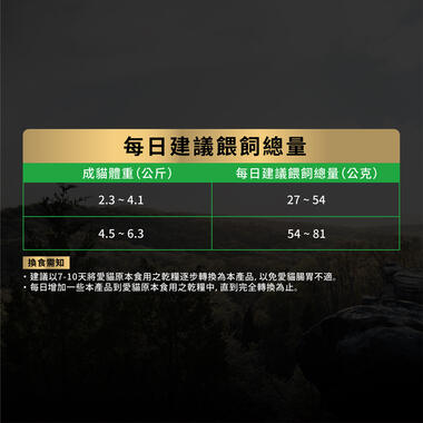 1. 本產品建議餵飼量係依照一般成貓平均營養需求所設計。每隻成貓的代謝能力、體重、活動量、年齡、結紮與否等均會影響其每日所需攝食量。若您發現您的愛貓有體重增加或體重減輕之情形,可自行調整餵飼量,以維持理想體態。