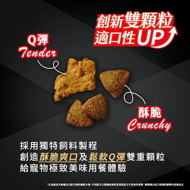 - 雙顆粒飼料,給愛犬Q彈與酥脆口感的極致美味用餐體驗